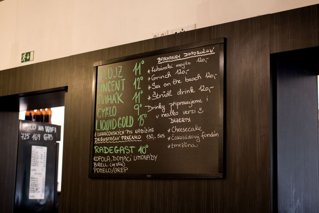 Nabídku piva jsme dlouho hledat nemuseli. Našli jsme ji vypsanou na tabuli, ale i na stole. Podnik lákal na šest druhů piva. Pět z nich pocházelo z domácího pivovaru. Nabídku doplňoval Radegast.